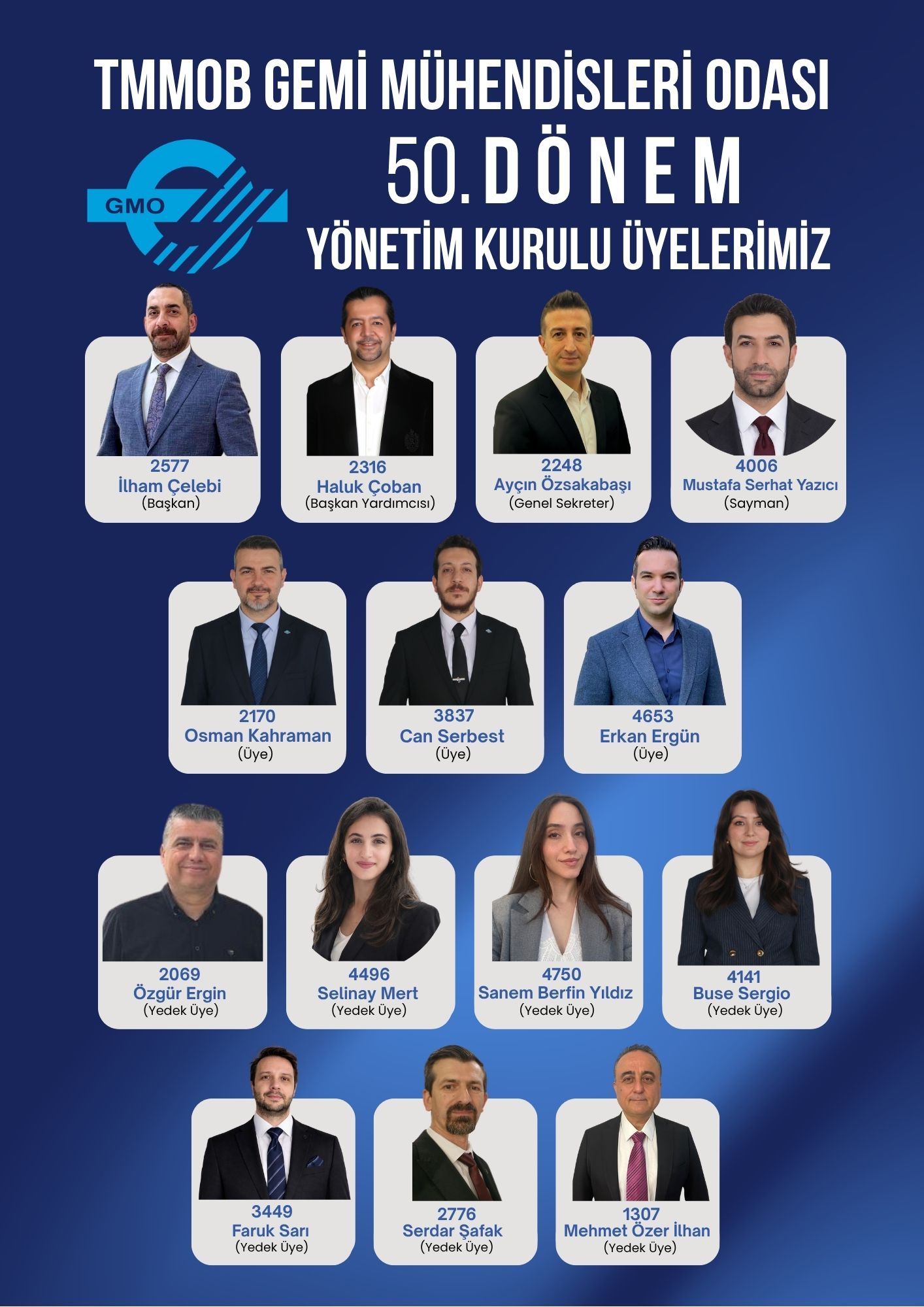 28-29 Mart 2026 tarihlerinde Odamızın 50. Olağan Genel Kurulu gerçekleştirildi. Genel Kurul Toplantısı ve yapılan seçimler neticesinde göreve gelen Yönetim Kurulu Üyelerimiz aşağıdaki gibi belirlendi.