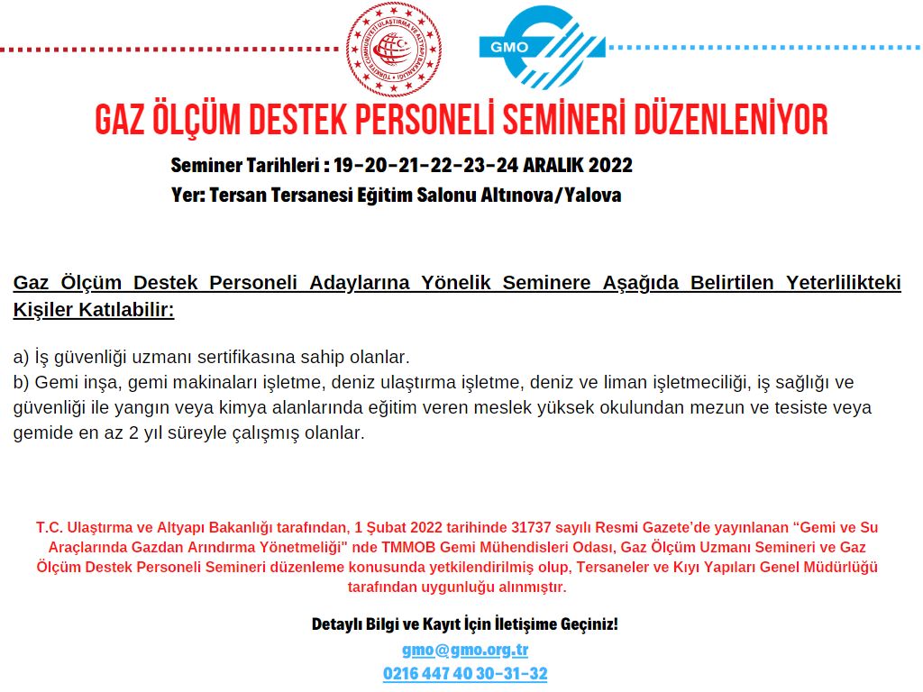T.C. Ulaştırma ve Altyapı Bakanlığı tarafından, 1 Şubat 2022 tarihinde 31737 sayılı Resmi Gazete’de yayınlanan “Gemi ve Su Araçlarında Gazdan Arındırma Yönetmeliği"nde TMMOB Gemi Mühendisleri Odası, Gaz Ölçüm Uzmanı Semineri ve Gaz Ölçüm Destek Personeli Semineri düzenleme konusunda yetkilendirilmiş olup, Tersaneler ve Kıyı Yapıları Genel Müdürlüğü tarafından uygunluğu alınmıştır.