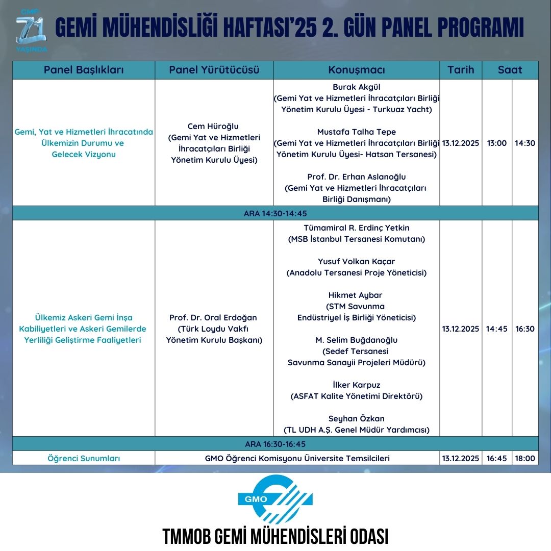 Gemi Mühendisliği Haftası’25 kapsamında gerçekleştirilecek panellerimiz, 12–13 Aralık 2025 tarihlerinde Piri Reis Üniversitesi Hazırlık Kampüsü’nde düzenlenecek.