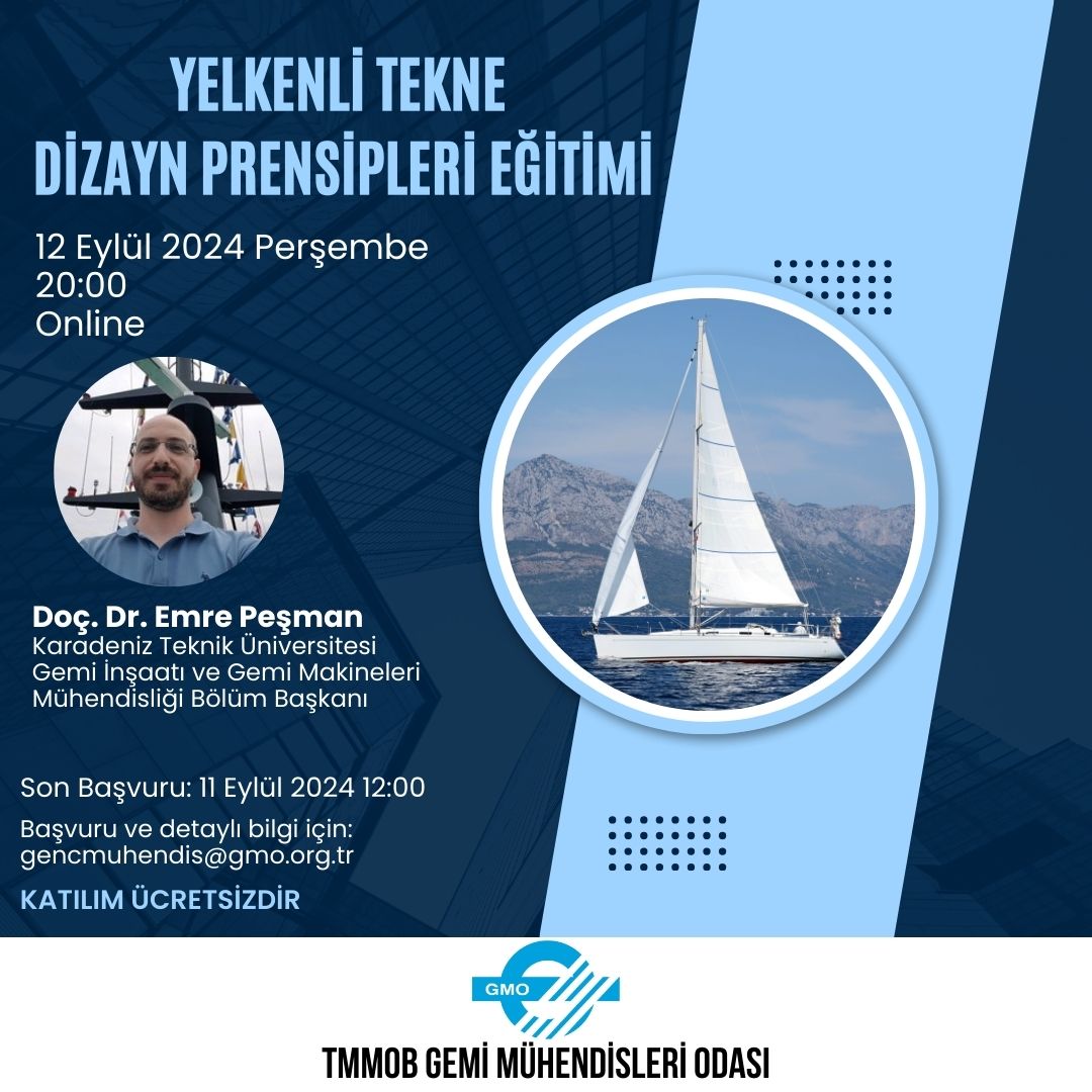 Genç Gemi Mühendisleri Komisyonu tarafından Yelkenli Tekne Dizayn Prensipleri Eğitimi düzenlenecek. 12 Eylül 2024 tarihinde online düzenlenecek eğitim, Karadeniz Teknik Üniversitesi Gemi İnşaatı ve Gemi Makineleri Mühendisliği Bölüm Başkanı Doç. Dr. Emre Peşman tarafından verilecek.